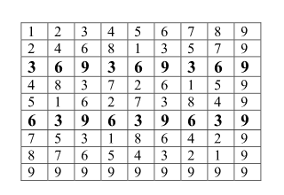 The power of the 3-6-9 trinity is better seen within the multiplication table below, which is based on Vortex-Based Mathematics formulated by Marko Rodin.[1] Vector-Based Mathematics brings numbers to life and shows that the number 9 is the control with all other numbers in dynamic action around the singularity point of 9. The number 9 never changes. All multiples of 9 are always equal to 9: i.e., 9 x 1 = 9; 9 x 2 = 18 and 1 + 8 = 9; 9 x 3 = 27 and 2 + 7 = 9. From the multiplication below we see that the only other time 9 is present is in the series of 3 or 6. The 3, 9, and 6 are always present together in a trinity: