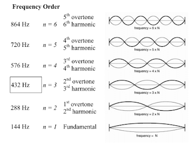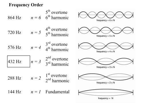 The frequency of 144 cps is harmonically related to the note of ‘A’ in Pythagorean tuning or 432 cps (the third harmonic above 144 as shown in figure 1 below).
